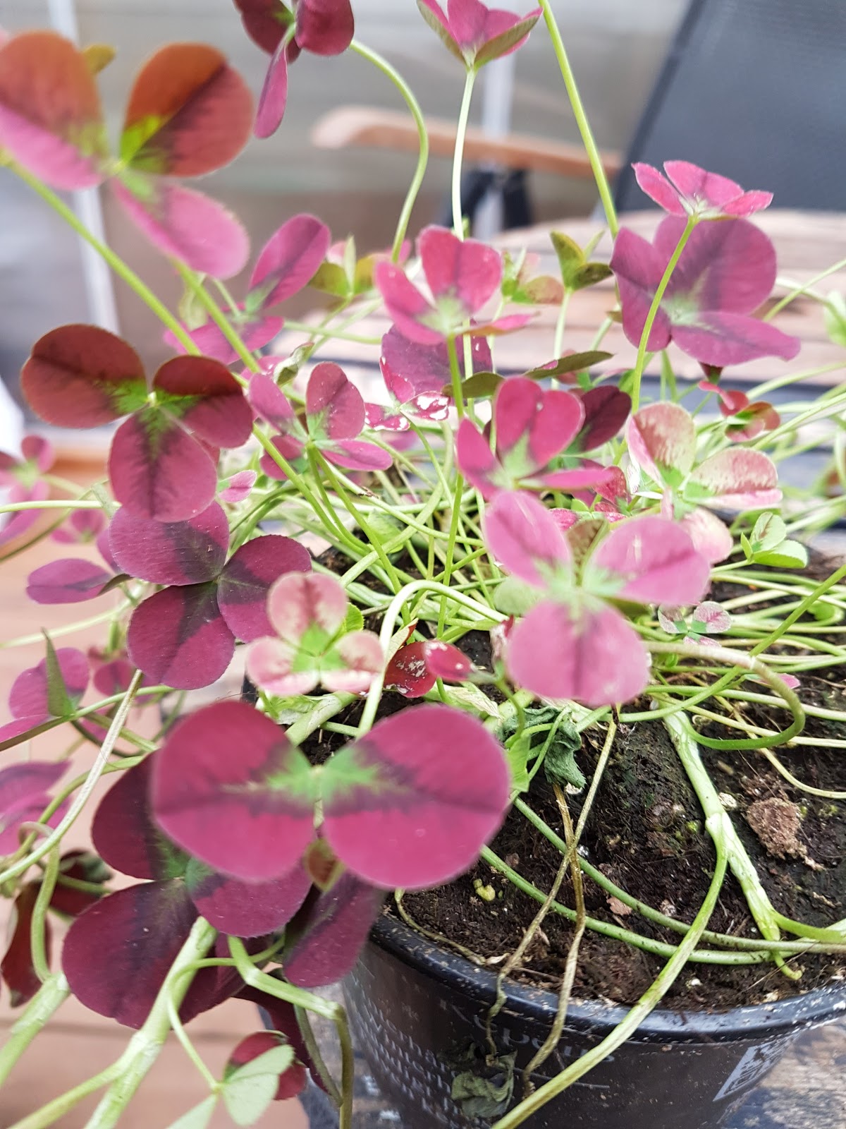 | Denne planten har jeg ikke hatt før. Trifoluim Repens. Ble litt sommerplanter i dag. Med dette kalde været stagnerer det litt ute. |