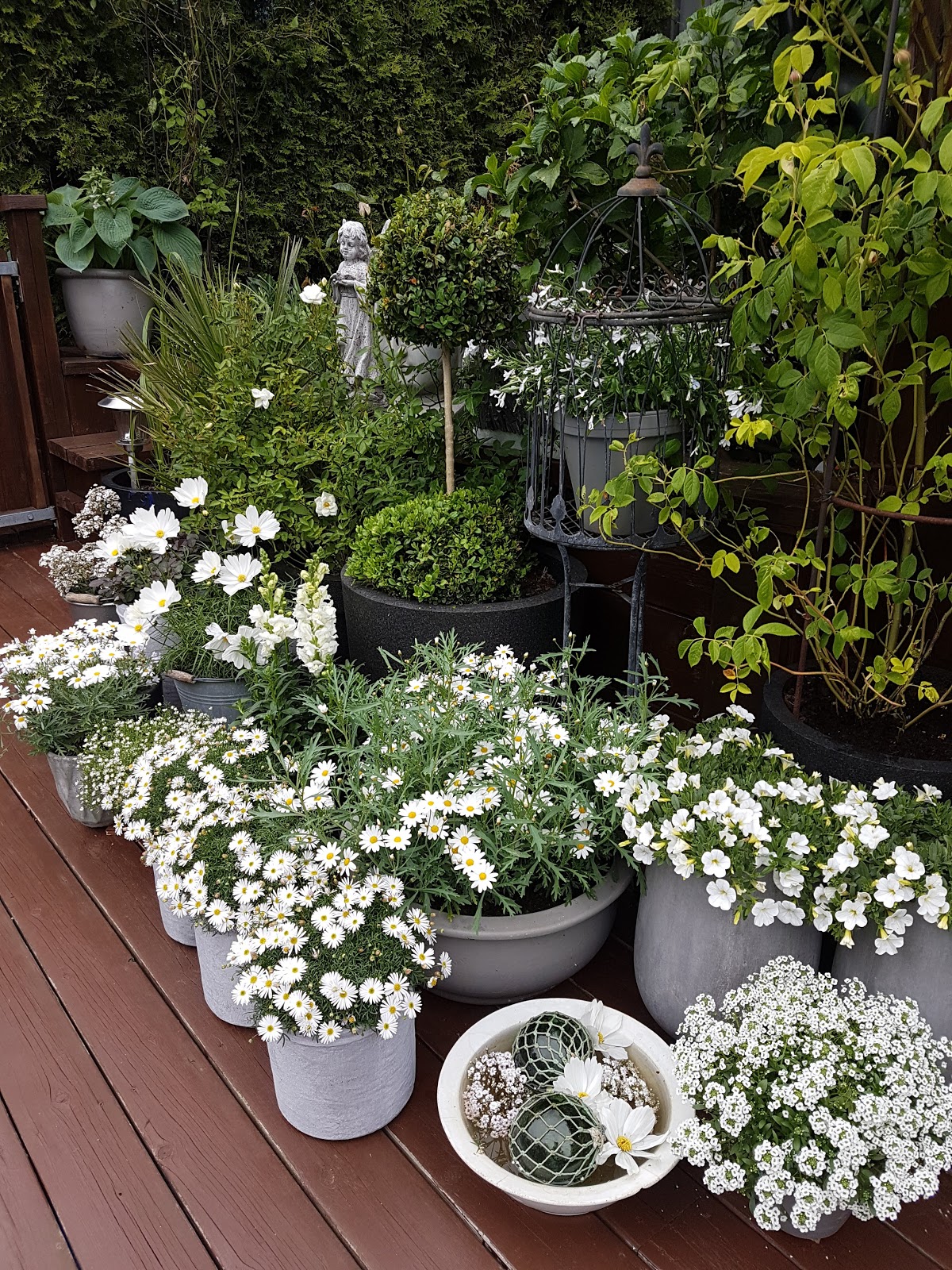 Bildene i dag kommer fra det hvite bedet ved bassenget. Benken som stod her har blitt flyttet. Fremdeles er det hvitt. Nå er det hvitt foran grønt bak og etterhvert blir det hortensia roser og prestekrager som blomstrer bakerst. Alt er plantet i krukker og potter og plantene er lett å skifte ut hvis de blir litt slitne. Dette bedet er fint i skumringen og når det er mørkt ser vi det godt.